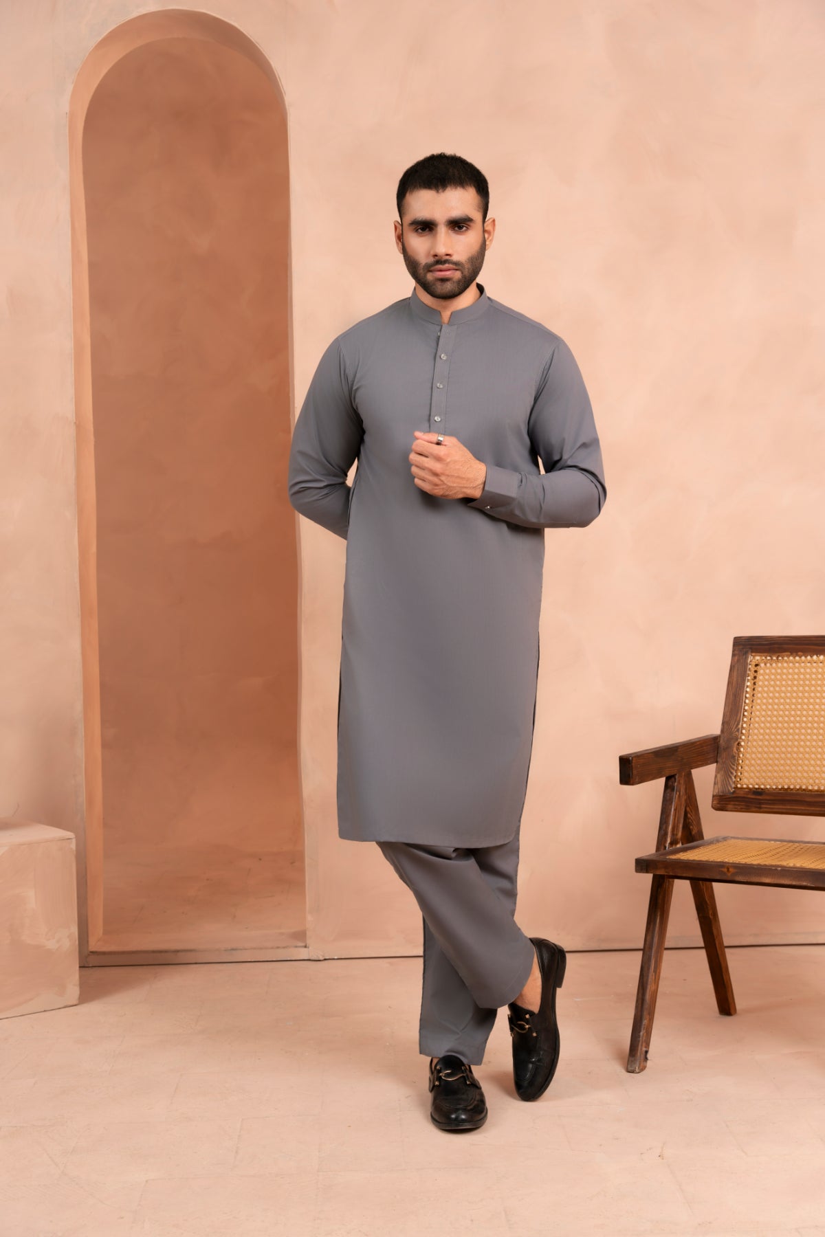 "Style Up This Summer Season With The Gunsmoke Grey Mandarin Collar Kurta Trouser, Which Is Designed For A Timeless Classic Fit And Stylish Appeal.